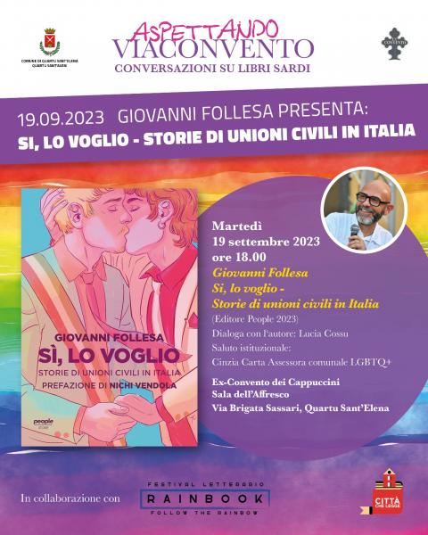 Appuntamento con l’autore Giovanni Follesa per la presentazione del suo “Si, lo voglio - Storie di unioni civili in Italiaâ€, con prefazione di Nichi Vendola; editore People 2023. Dialogherà con l’autore Lucia Cossu, mentre per i saluti istituzionali sarà presente l’Assessora comunale alle Politiche di genere e LGBT Cinzia Carta.