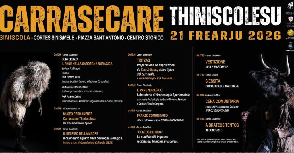 Nello stesso giorno, spostandosi verso la Baronia, anche Siniscola celebra il suo carnevale con Su Carrasecare Thiniscolesu. Protagoniste sono le maschere di S’Orcu e Montiarvu e Sos Tintinnatos, figure tipiche della tradizione locale che animeranno il corteo in programma alle 17.30 lungo le strade del centro storico. La sfilata sarà preceduta dalla Vestizione, uno dei momenti più suggestivi della giornata.