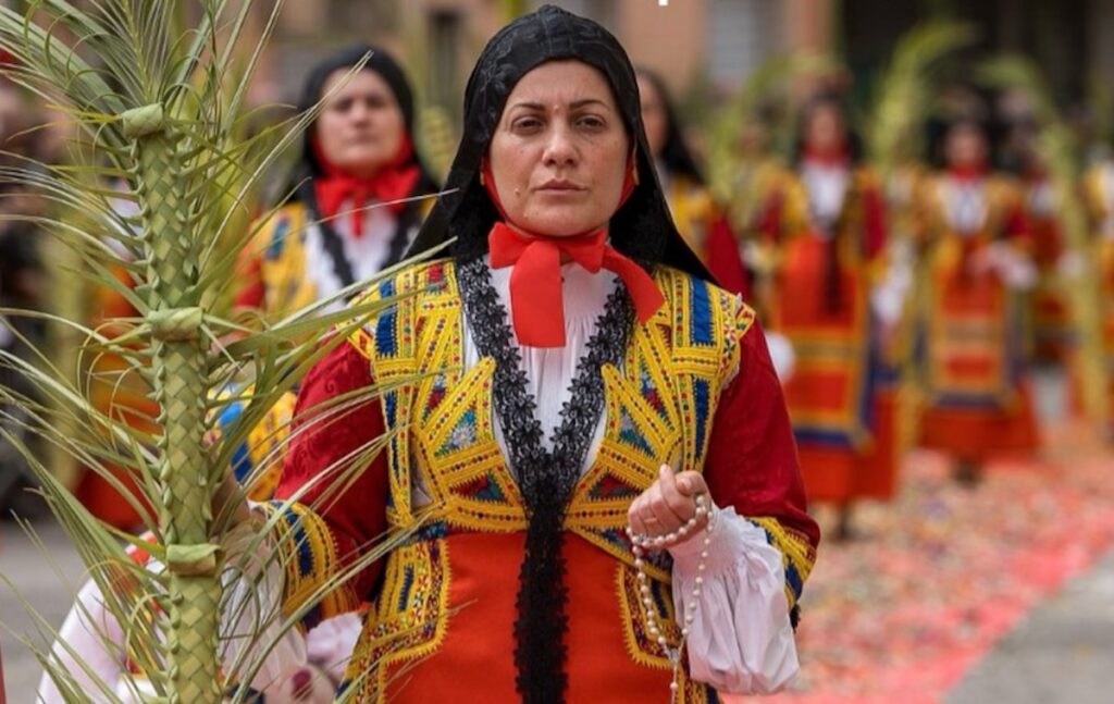 Al centro dell’organizzazione ci sono le Prioresse, donne laiche del paese che, nel corso dell’anno, lavorano alla preparazione delle celebrazioni e ne curano ogni fase. Sono settanta in tutto, suddivise in dieci compagnie dedicate a diversi santi e devozioni locali, e rappresentano uno degli elementi più distintivi della Settimana Santa desulese. Durante la Domenica delle Palme indossano l’abito tradizionale di gala e portano con sé le palme intrecciate, segno visibile di una ritualità che unisce estetica e devozione.