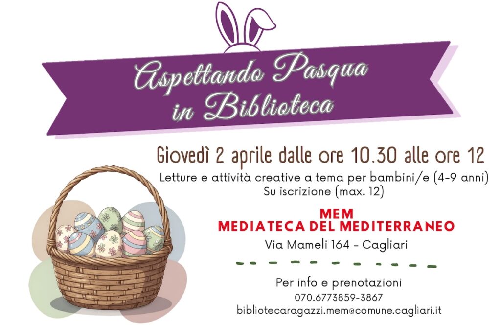 In occasione della Pasqua 2026, la MEM – Mediateca del Mediterraneo di via Mameli a Cagliari propone una mattina dedicata ai più piccoli tra letture condivise e attività creative. Giovedì 2 aprile, dalle 10.30 alle 12, nella Biblioteca Ragazzi, bambini e bambine dai 4 ai 9 anni, accompagnati dai genitori, potranno partecipare a un laboratorio gratuito. L’iniziativa è riservata a un massimo di dodici partecipanti, per garantire uno spazio di ascolto e sperimentazione adeguato.